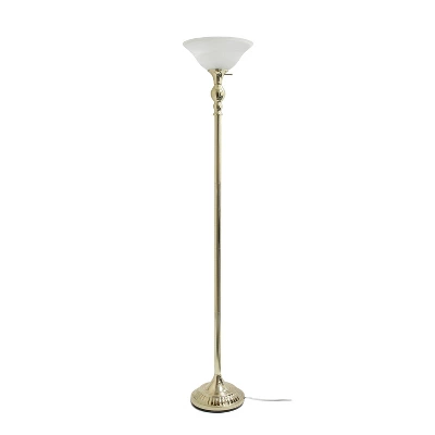 Light up your bedroom, office, foyer or living room with this elegant yet affordable 3 light floor lamp. It features a stunning gold finish and marbleized white shades with spiraled cut glass to complete the timeless look. This is a very traditional style lamp that is primarily made up of metal contents.