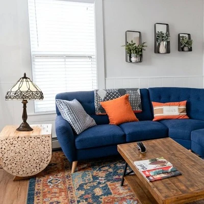 Create a distinct focal feature on your console or side table with this Tiffany-style table lamp crafted from 234 copper foil-wrapped glass pieces. The decorative, copper-finished base beautifully complements the brown and white shade, and the cabochon gemstone embellishment adds a touch of glam for extra visual appeal.