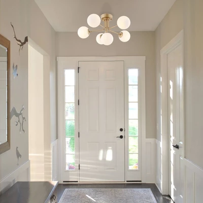 Replace outdated ceiling lights with this bistro classic for an instant French-inspired makeover. At just 12″ high, this fixture is ideal for low ceilings. Our light fixtures work with LED-compatible dimmers; professional installation is recommended. Eco-friendly 2W LED bulb included. Takes 6 bulbs and compatible with TYPE “G” 25W or CFL 5W or LED 5W. Color Temperature: 2700K. CRI: 80. Before cleaning any lamp shade or fixture, disconnect the power source. Wipe with a soft, dry cloth. Avoid the use of chemicals and household cleaners as they may damage the finish.