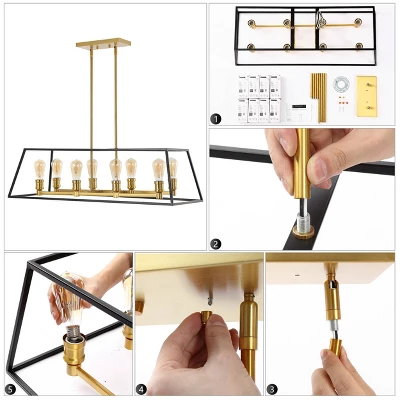 The linear black metal frame has classic brass-gold fittings, while the open frame adds a modern touch with its many LED bulbs. This adjustable-height pendant is suitable for ceilings up to ten feet high; our light fixtures work with LED-compatible dimmers. Give your home an instant makeover with this linear pendant’s modern, minimalist silhouette. Eco-friendly 4W LED bulb included. Takes 8 bulbs and compatible with TYPE “A” 40W or CFL 13W or LED 9WBefore cleaning any lamp shade or fixture, disconnect the power source. Wipe with a soft, dry cloth. Avoid the use of chemicals and household cleaners as they may damage the finish.