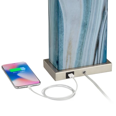Refresh your decor with this pair of lamps from the 360 Lighting brand. Each lamp features a built-in USB port in the base so you can charge phones and other devices. The handsome free-form blue marble pattern is crafted from cast resin, and is an ideal look for modern or coastal style decorating. Up top are white rectangular lamp shades. The set takes 17 watt medium base LED bulbs that have a light output comparable to 100 watt incandescent bulbs.