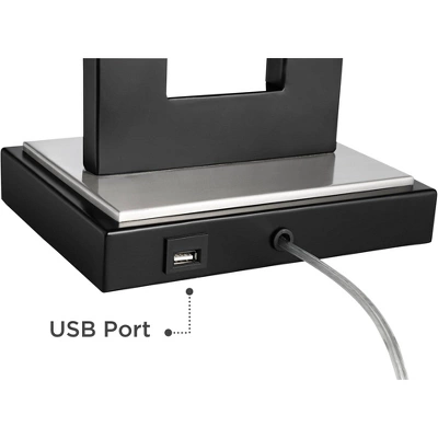 A contemporary two-tone look and convenient amenities are showcased in this modern table lamp from the 360 Lighting brand. The metal construction of this lamp comes in a handsome black finish with silver tone accents. On top is a rectangular shade that puts a crisp, clean finishing touch to this geometric design. With its charging port, this geometric, visually striking lamp is perfect for a modern bedroom or family space. Comes with a black marble riser that you place under the lamp base to give the design extra height and style.