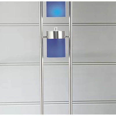 - Polished metal base with blue acrylic shades