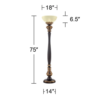 With a glass shade framed by scalloped leafing, this regal torchiere floor lamp draws attention to its majestic qualities with dramatic detailing. Wood tones combined with muted gold and a frosted glass bowl convey a finished elegance while casting an inviting, warm light.