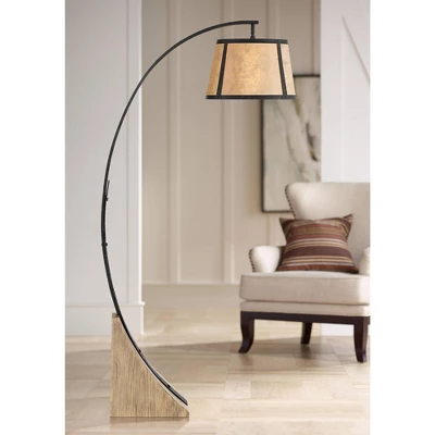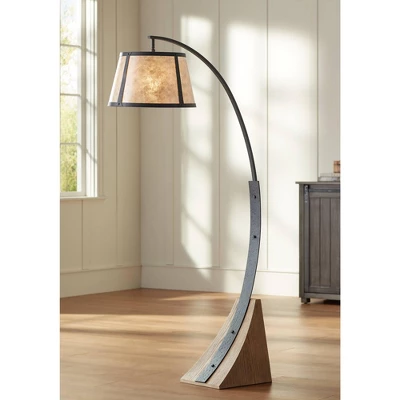 The Oak River collection from the Franklin Iron Works brand offers a line of stylish floor lamps that bring a beautiful organic style to any setting. This Mission-style arc floor lamp comes in a widely arching metal frame dressed in a dark gray finish. A solid wood base at the bottom provides stability and balance. The blond mica shade is fashioned from naturally occurring minerals, meaning slight color variations will occur in each shade.