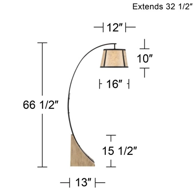 - 66 1/2″ high. Base is 12 1/4″ wide x 13″ deep x 15 1/2″ high. Shade is 12″ across the top x 16″ across the bottom x 10″ high. Arm extends 32 1/2″. Weighs 19 lbs