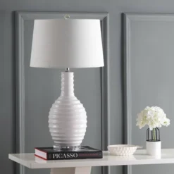 Brighten up your space in modern style with this Large Ceramic Jar Table Lamp from Threshold™ designed with Studio McGee. This table lamp includes a large pot-like ceramic base with two handles and a drum-shape shade. The gray ceramic base comes with a striped pattern that complements the white shade for an appealing look. Designed with a dimmable light setting, this ceramic table lamp helps you adjust the light according to your need — just place it in your reading nook or living room to create a beautiful setting.