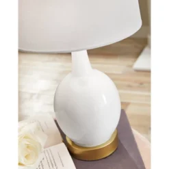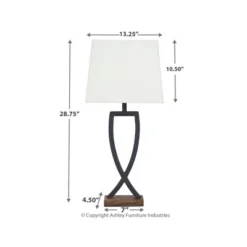 Donβt let lighting throw you for a loop. The beautiful curve of this lamp will add the right contour to your space. With a classic black finish, the arc of this lamp ends with an adjustable metal shade. The integrated wireless charging and USB port add a convenient way to keep your devices powered. Black finished desk lamp. Metal shade. Adjustable neck. (1) Wireless charger and (1) USB charging port. On/off switch. (1) E26 socket, type G bulb recommended – 40 watts max or 8 watts max CFL. Matching floor lamp -L206001. Signature Design by Ashley is a registered trademark of Ashley Furniture Industries, Inc.