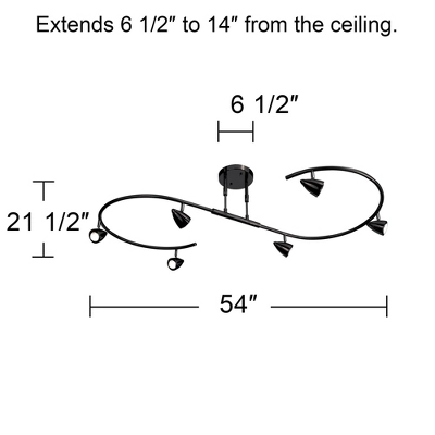 Clean, cool, and contemporary, this eye-catching, “s” shaped bar track light kit provides instant glamour and visual appeal. It comes in a crisp black finish and features six lights, each of which is fully adjustable. You can also change the hang height by adjusting the dual downrods. The line voltage track-style fixture is easy to install; just install in a ceiling junction box like a regular ceiling fixture.