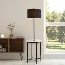 61.5″ Amelia Modern Floor Lamp With Table And Built-In USB Matte Black/White Marble – Teamson Home