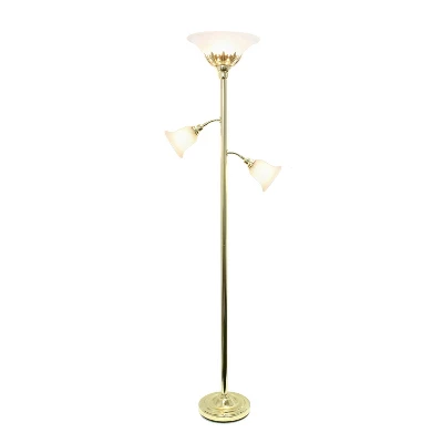 Brighten up your living space with this elegant 3 light floor lamp. It features 2 adjustable reading lights with a main torchiere light so that you can manipulate the light to focus on the area of your choice. The beautiful gold metal base is accented by scalloped white glass shades to complete the timeless look. Perfect for your bedroom, office, foyer or living room!
