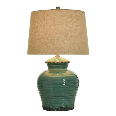 There is a lot of beauty to be found in the Turquoise Ceramic Jug Table Lamp from the Signature Collection by StyleCraft Home Collection. The body, which comes with a turquoise finish, is adorned with a beige hardback linen shade. Place it on any table around your house, whether it is in your living room or bedroom. This will pair well with rustic and bohemian styling and is sure to be a conversation piece. Due to lighting and monitor differences, actual colors and finishes may vary slightly from what appears online