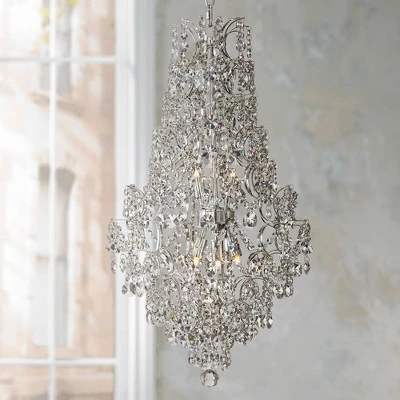 Opulent and luxurious, the Marilyn chandelier looks as if it was dripping with diamonds. Crystal strands and droplets cascade down from a delicate chrome finish frame, resulting a glittering glam look. This sparkling contemporary crystal chandelier is perfect for dressing up a dining room or entryway area.